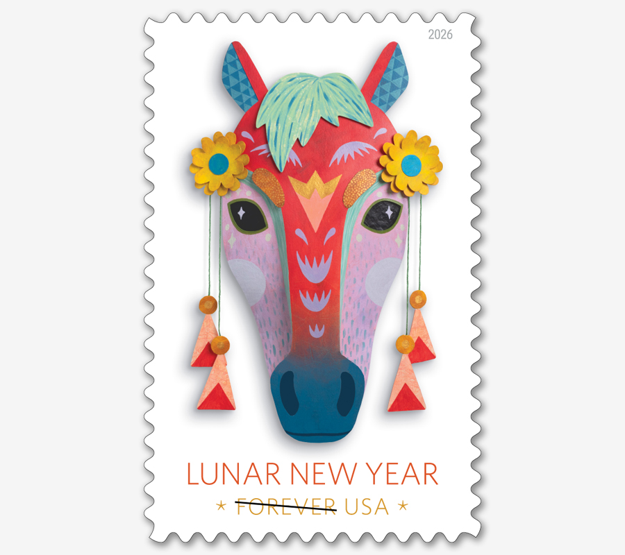 • Year of the Horse, the seventh stamp in the current Lunar New Year series, will feature paper-cut masks by artist Camille Chew.