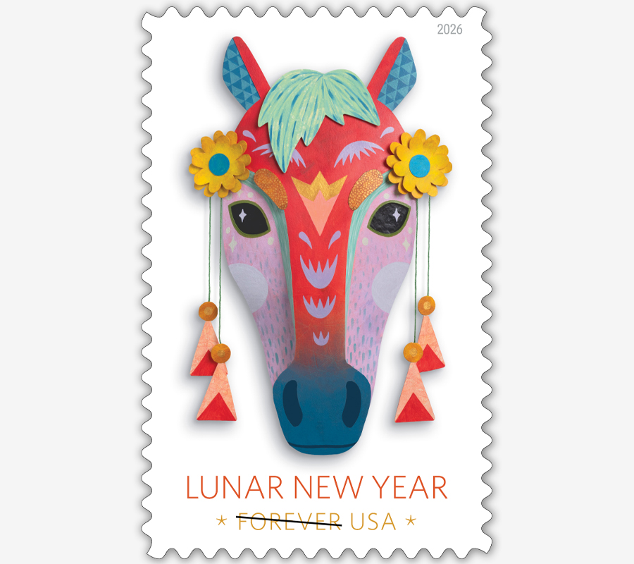 Antonio Alcalá, an art director for USPS, designed the stamp featuring an original horse mask created by Camille Chew.