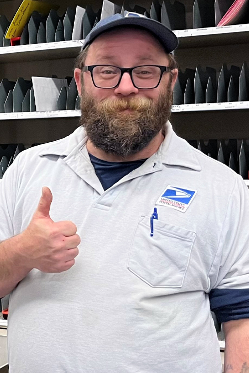 USPS employee giving a thumbs-up and wearing a light-colored polo shirt and blue hat