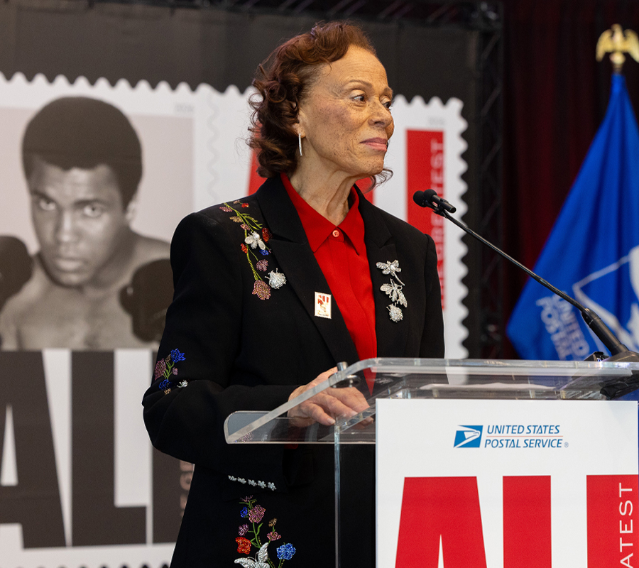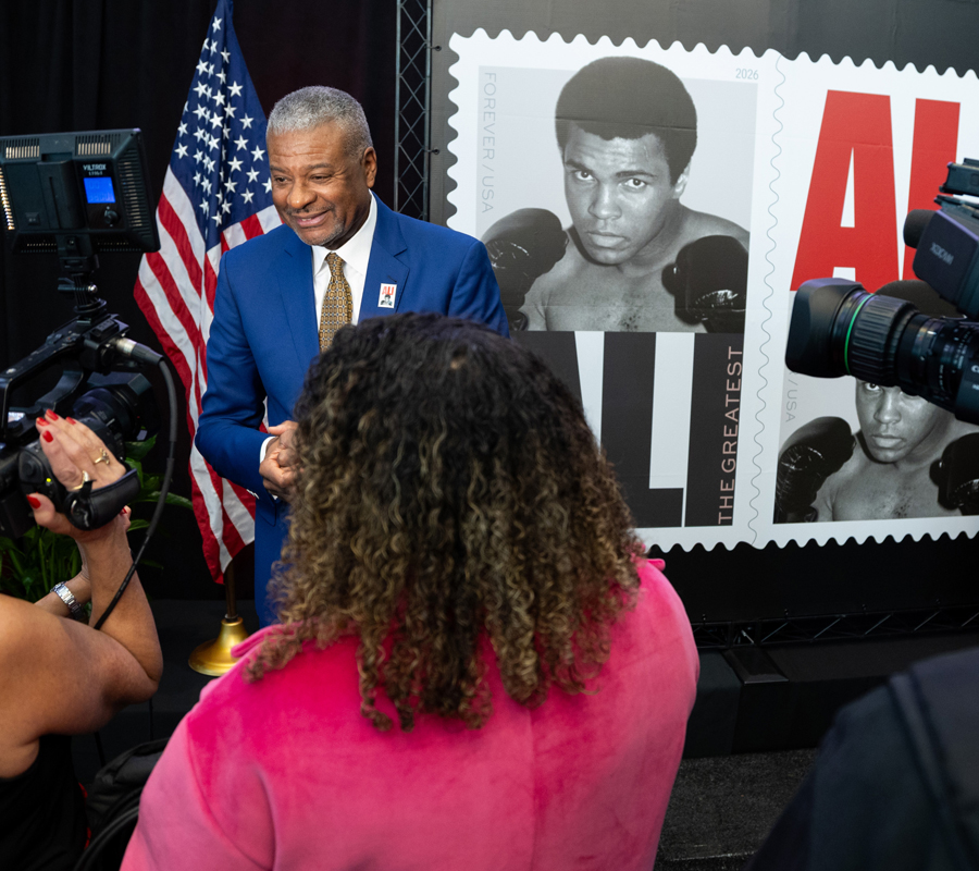 Other speakers at the stamp ceremony included Lonnie Ali, Ali’s widow and CEO of the Muhammad Ali Center; Jacqueline Coleman, Kentucky’s lieutenant governor; Louisville Mayor Craig Greenberg; Greg Fischer, a former mayor of Louisville; Neil Leifer, sports photographer and filmmaker; and John Ramsey and Peter Villegas, Muhammad Ali Center board members.