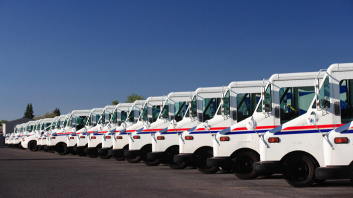 USPS delivery vehicles parked in a row